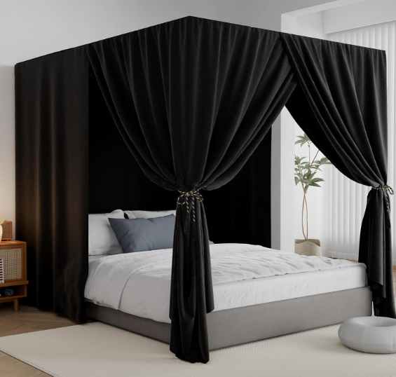 Nothing sets the tone for a dark feminine bedroom quite like a velvet canopy bed. The richness of the velvet, especially in deep hues like emerald, black, or crimson, adds an undeniable sense of luxury and softness. Draped with black lace curtains, the bed becomes the room’s dramatic centerpiece—romantic, mysterious, and slightly theatrical. The light filtering through the lace creates delicate shadows that dance around the room, adding a magical, almost vintage touch that feels both powerful and serene.