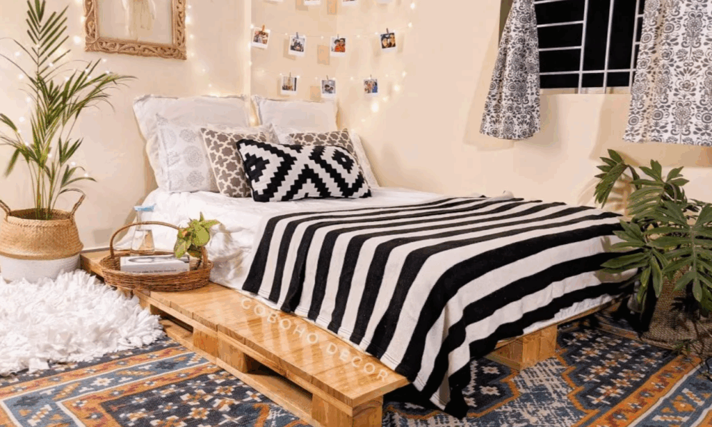 A boho pallet bed with cushions brings a relaxed, earthy vibe to your bedroom, combining the rustic appeal of pallets with the cozy comfort of soft, colorful cushions. The low, laid-back frame creates a sense of openness, while the addition of cushions in various textures and patterns adds depth and warmth. This design is perfect for creating a peaceful sanctuary, a bohemian-inspired retreat where comfort and style come together effortlessly.