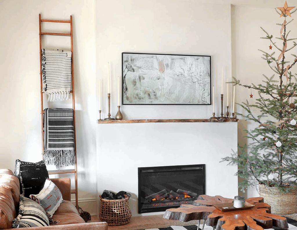 A mantle styled with cozy textured layers invites you to slow down and savor warmth and comfort. Plush throws, chunky knits, and soft pillows draped nearby or on adjacent seating complement the mantle’s styling, which might include woven baskets, layered rugs, or tactile ceramics. These elements add depth and invite touch, making the space feel lived-in and welcoming.