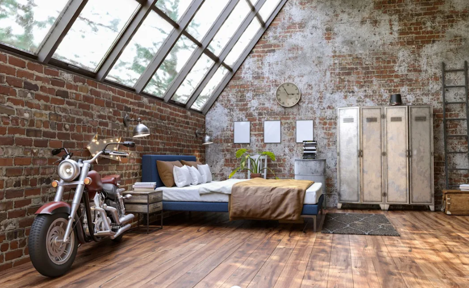 To soften the look just enough, throw in cozy but rugged textiles like a distressed leather chair, gray wool throws, or a worn rug that hints at decades of use. Stick with a neutral palette—charcoal, rust, black, and faded browns—that feels cohesive and grounded. If there’s room, a metal-framed bed with minimalist lines pulls it all together without making it feel staged. This room captures the perfect balance between raw energy and intentional design.